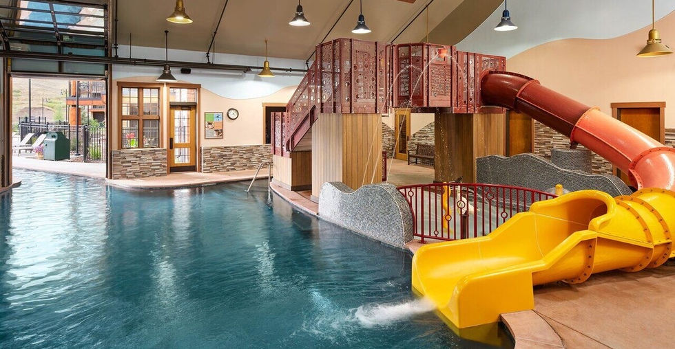 Enjoy upscale amenities · both ski and bike valet · Blue River Bar Lounge, luxury health club like fitness center · heated lavish indoor - outdoor pool · hot tubs · indoor waterslide · play area w/splash pad for kids.